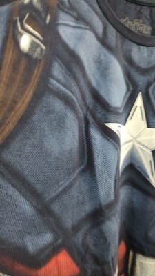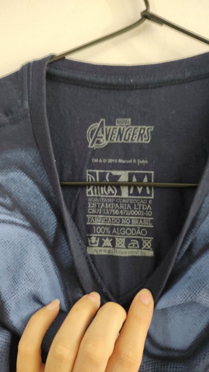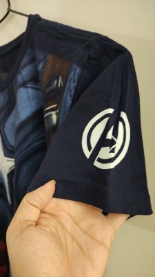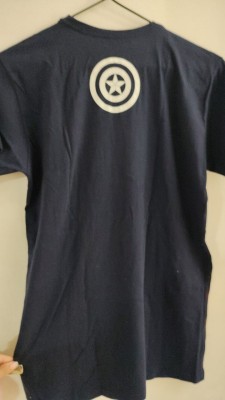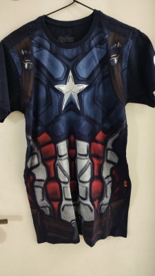 CAMISETA MASC TAM M AZUL MARINHO COM ESTAMPA DA ROUPA DO CAPITAO AMERICA, DE ALGODAO, SEMI NOVA PITIKAS, LARGURA 49CM, COMPRIMENTO 77 CM, CONFORME FOTOS